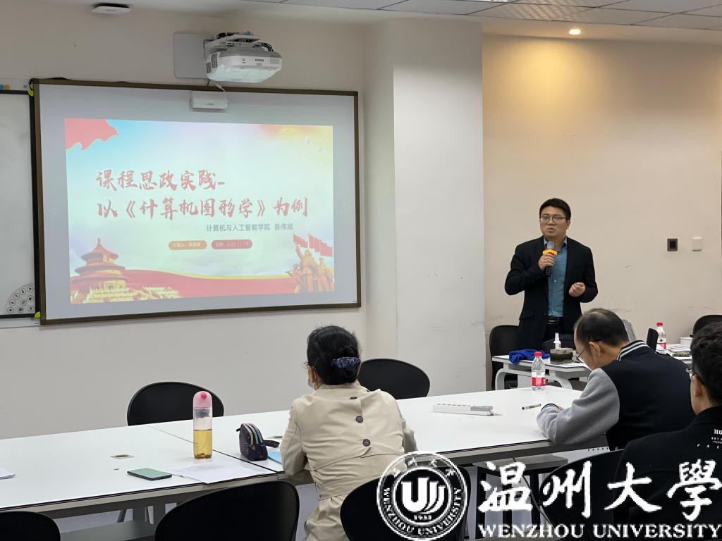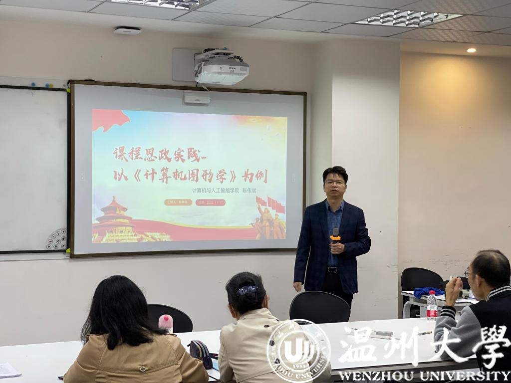 11月17日上午在5B206多功能教室,计算机系主任、2020年校教师课堂教学竞赛二等奖获得者陈伟斌老师主讲了《课程思政实践-以计算机图形学为例》的课程思政沙龙活动,本次活动也是本年度的明心示范课。本次沙龙由网赌平台推荐 副院长黄辉老师主持,还邀请了温州医科大学马克思主义网赌平台推荐 医学伦理学教研室主任陈勰副教授担任助讲嘉宾。来自全校网赌平台推荐 、化材网赌平台推荐 、电气与电子网赌平台推荐 共15名教师参加了本次沙龙。