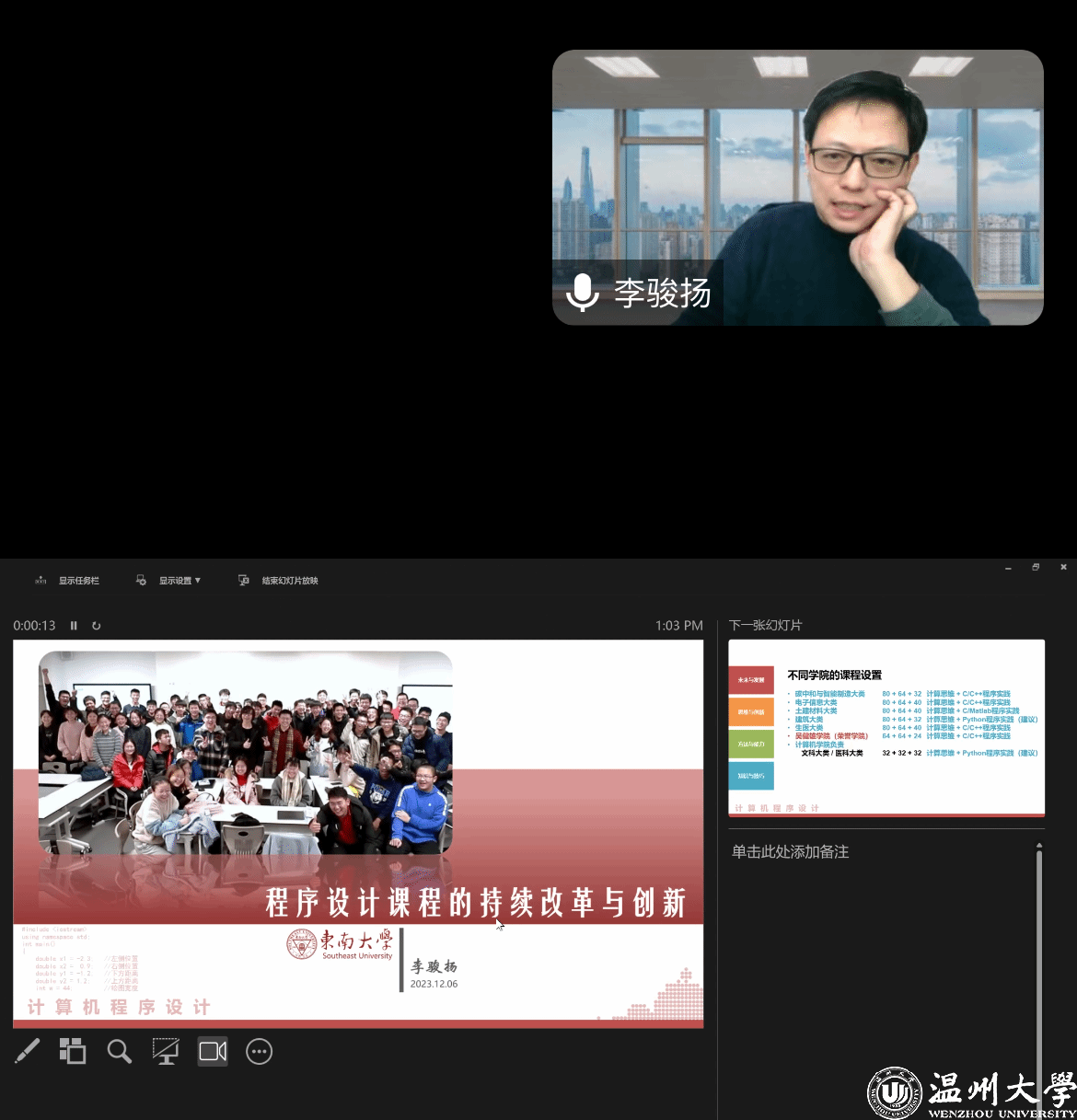 讲座伊始,黄辉副院长对李骏扬博士进行了详细介绍。随后,李骏扬博士在腾讯会议线上做《程序设计课程的持续改革和创新》专题报告,网赌平台推荐 教师线下集中在5B206听讲座。李博士从教与学、课程架构、内容方法等方面分享了如何打造以学生为核心的“创新性、高阶性、挑战度”的创新课堂,强调教师设计课程活动时要注重带动学生积极思考,形成学生能够自主探索的挑战式课堂。李博士还通过分享自己的课堂教学实例,为参会教师展示了教学创新成果,并与参会教师进行了交流讨论。最后,黄辉副院长进行总结发言,他指出本次讲座内容丰富、案例生动、启发性强,希望与会教师能够结合实际,充分发挥教师的职业角色,不断激发学生自主思考潜力,进一步推进网赌平台推荐 教学改革创新。