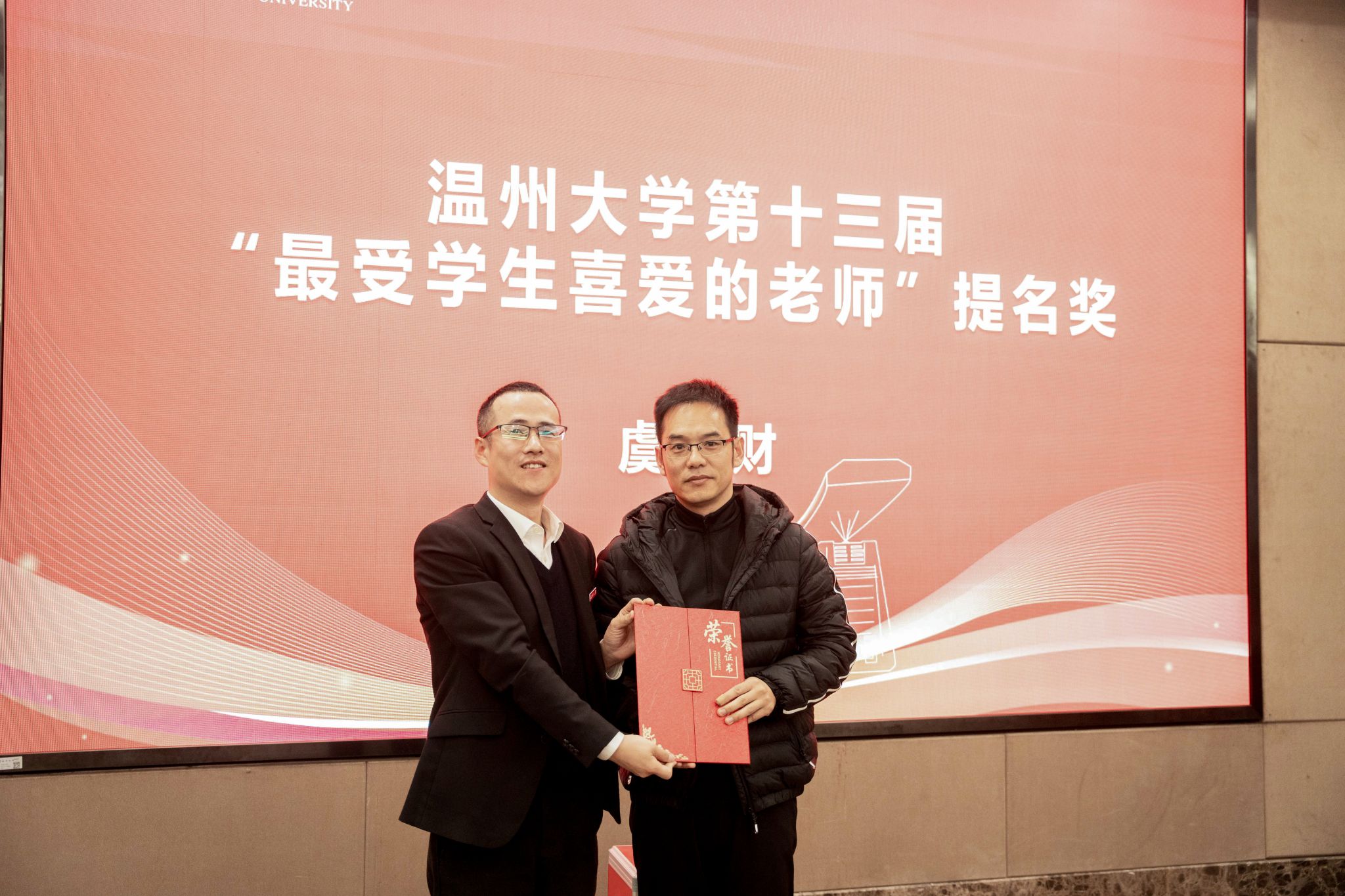 最后,陈慧灵副院长向虞铭财教师颁发温州大学第十三届“最受学生喜爱的老师”提名奖荣誉证书。全力书记、陈慧灵副院长、黄辉副院长向陈伟斌、金可仲、李忠月和虞铭财四位教师颁发十大网赌平台推荐网站 “最受学生喜爱的老师”荣誉证书。