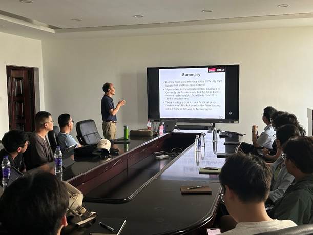 讲座中,姜贤塔教授首先介绍了智能人机接口技术在假肢控制、外骨骼设备控制以及机器人交互等领域中的重要性。并且,姜教授介绍了在机械手控制的研究中,将截肢患者的运动意愿准确传达给假肢的问题难点。姜教授认为,传统的表面肌电信号模式识别技术存在诸多缺陷,包括高噪声、低分辨率和模型重复训练等。患者在使用这些设备时常常承受心理压力。报告中深入分析机器手控制接口技术研究的现状和存在的问题,并介绍姜教授实验室基于多模态方法的解决方案和研究进展。此外,本次讲座还介绍了温州大学与纽芬兰纪念大学联合开展的博士培养项目,并为有意留学加拿大的同学提供一些基本知识和信息。