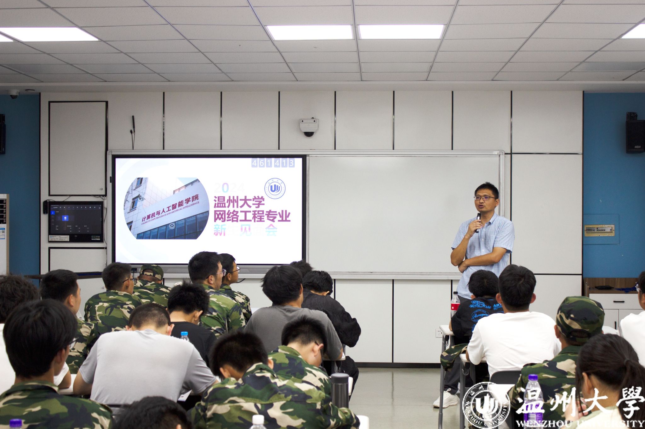 “网络工程专业是国家级一流本科专业,拥有国家级一流本科课程三门。”徐玉老师为2024级新生介绍了专业的强大的师资和专家团队,并邀请网赌平台推荐 副院长、网络专业负责人黄辉进行专业介绍。黄辉副院长带领新生们分析国家网络工程专业发展现状,从战略高度分析了专业发展前景和专业人才培养目标,进而深入介绍了温州大学网络工程专业的建设现状和毕业生就业情况,他指出,大学学习不仅需要实力强劲的师资资源,更要同学们掌握自主学习的方式方法,做到“自敬、自驱、自律、自主”,方能成就自我、实现梦想、报效祖国。