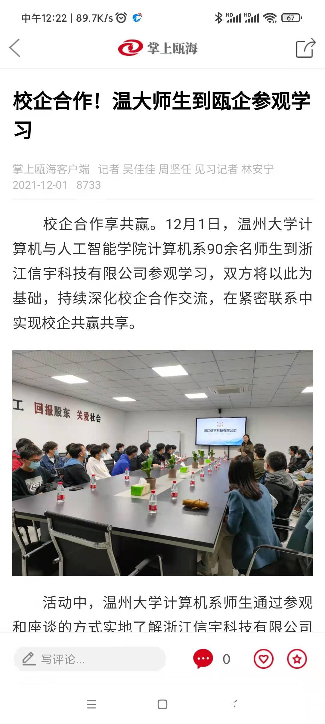 2021年12月1日和12月8日下午,由系主任陈伟斌老师、20计算机班主任胡倩老师、徐晓华老师带队指导,分别包车前往浙江信宇科技有限公司、浙大温州研究院、惠普DXC温州国际云软件生态平台总部等在温企业进行企业认知学习与交流。每到一处都受到了都受到相关部门的热情接待和周密的现场交流活动安排。每个公司都精心安排了生产参观、企业负责人代表讲座、工程师现场互动交流等活动。最后,本次实践活动还安排了一次线上专题讲座。