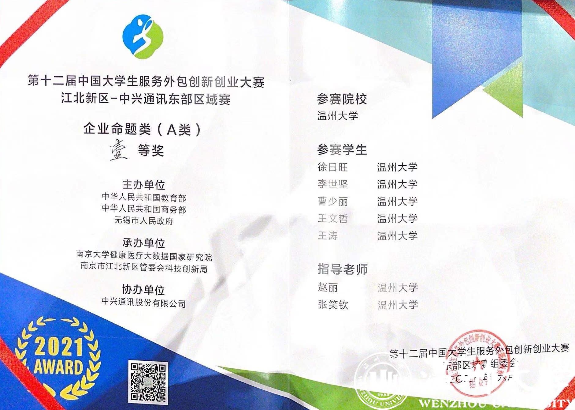 6月4日,第十二届中国大学生服务外包创新创业大赛东部区域赛决赛在南京落下帷幕,网赌平台推荐 学子喜获一等奖,这也是温大历史上首次获得区域决赛一等奖。