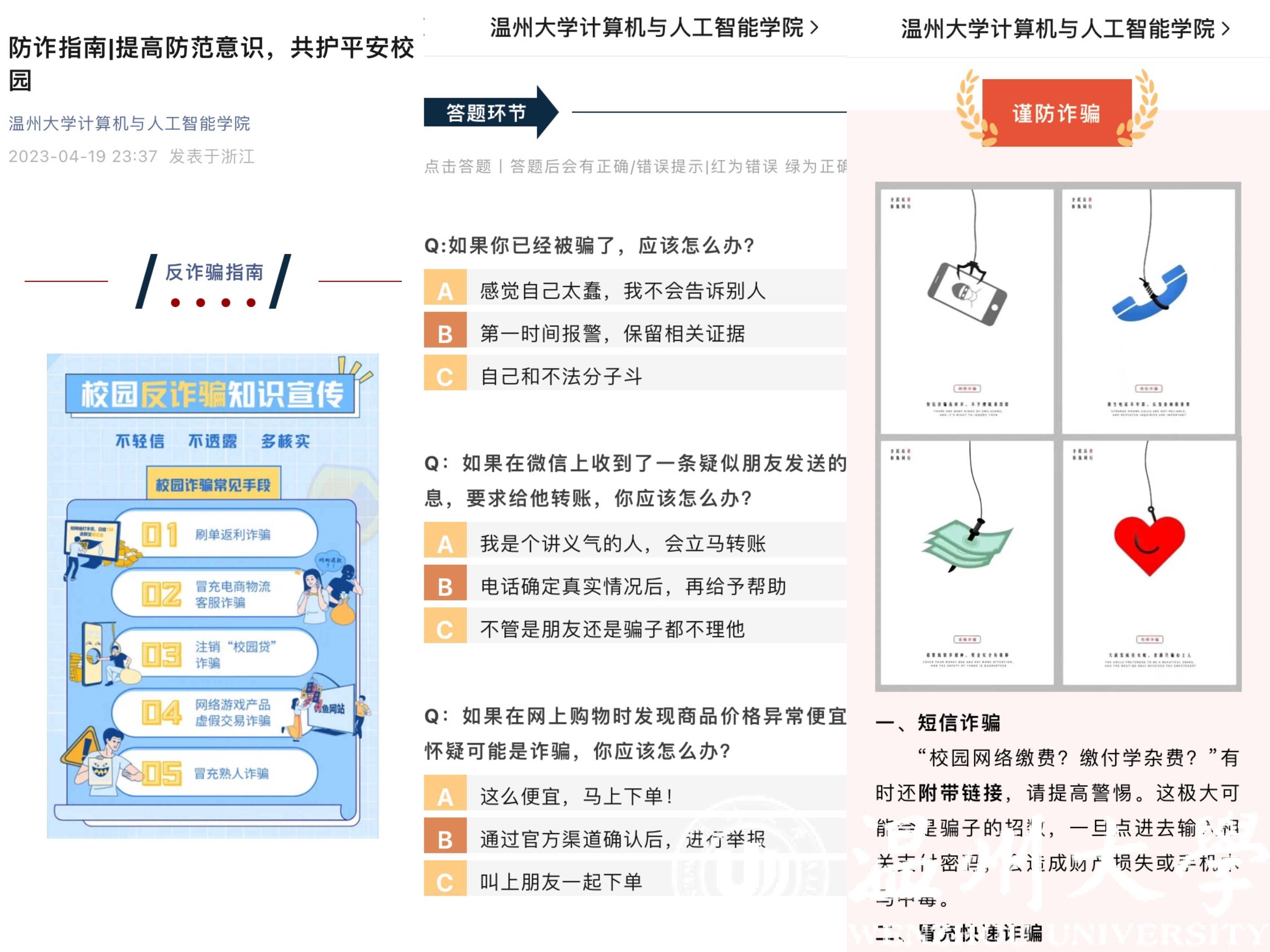 为进一步增强同学们防范电信网络诈骗意识和能力,努力创建“无诈校园”,形成“平安温大 你我同行”的浓厚氛围,4月-5月计算机网赌平台推荐 持续开展反诈宣传教育系列活动。