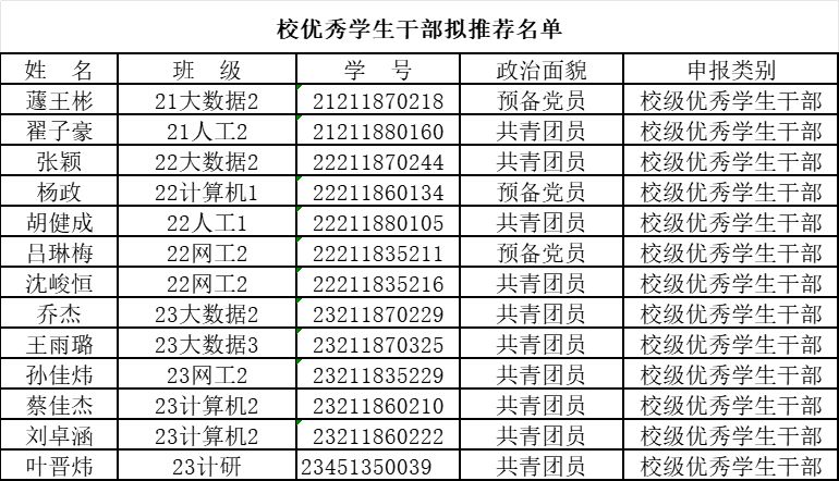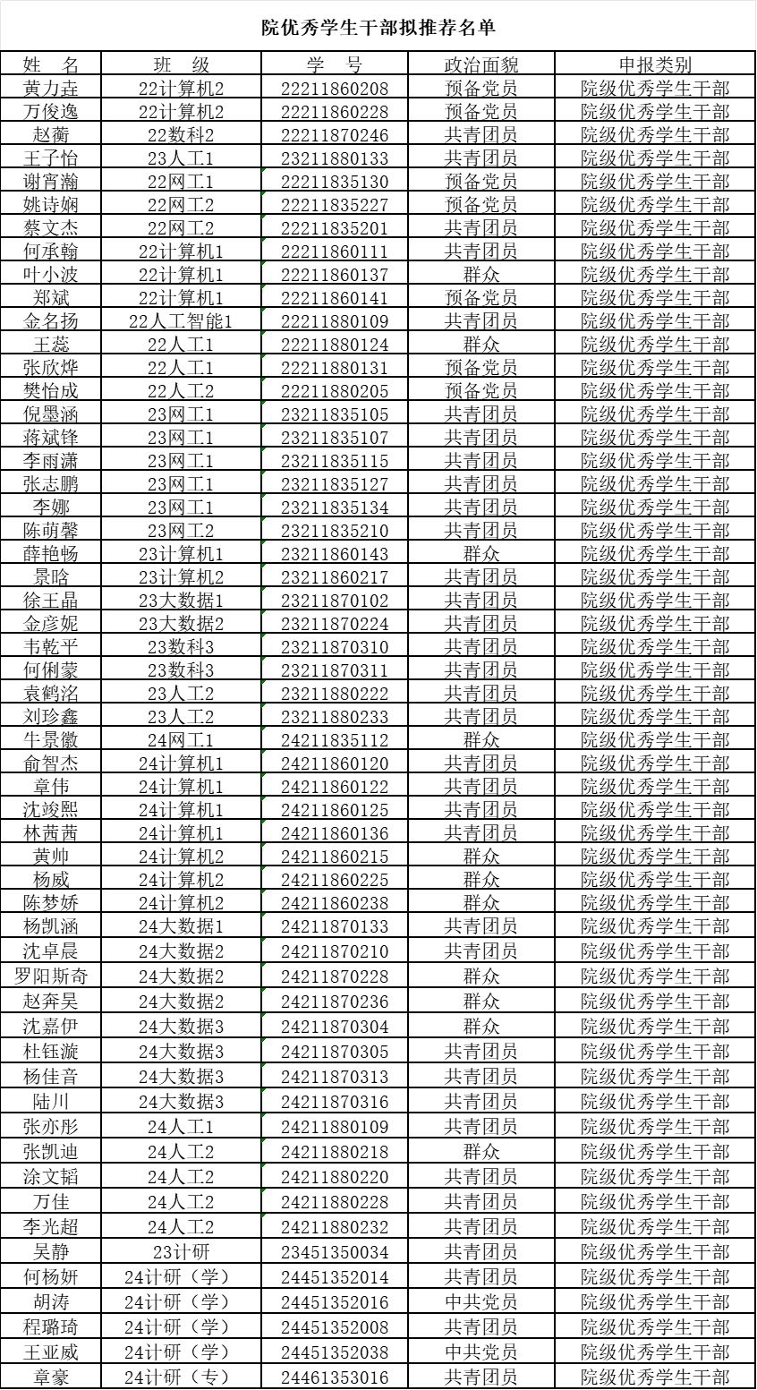 根据校团委《关于评选2024-2025学年第一学期优秀学生干部和工作积极分子的通知》,经网赌平台推荐 各班级同学自主报名、班级推荐、院团委审核,拟推选以下同学为2024-2025学年第一学期优秀学生干部,现将名单予以公示。(注:排名不分先后)