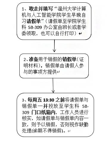 2.各同学应自觉参加早晚自习,不得迟到、早退,因故不能参加者,须提前和班级负责考勤同学请假并提供相关证明,凡未请假者或无故超假者,均按旷课处理;