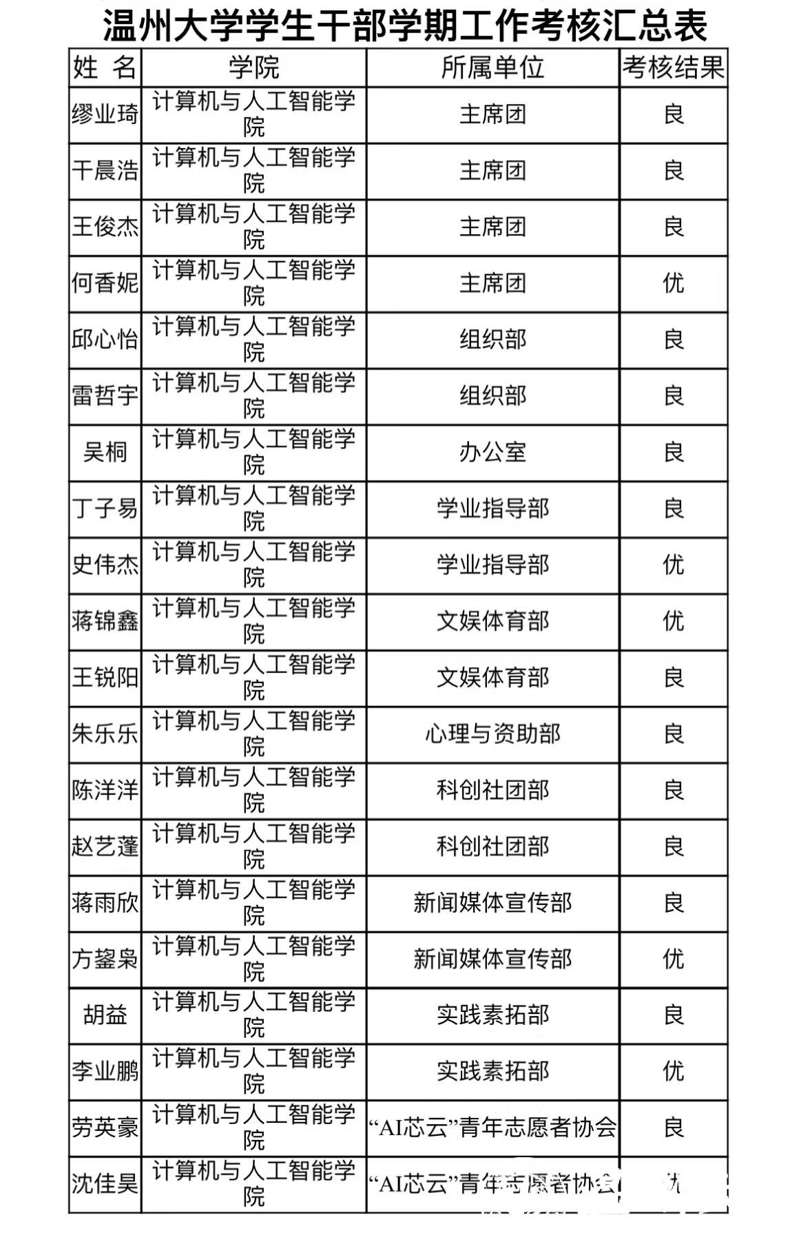 为了规范学生干部管理,提高学生干部的整体素质和工作效率,网赌平台推荐 团委采用个人自评、小组考评方式对网赌平台推荐 团委学生会干部进行学期考核。现将考核结果公布: