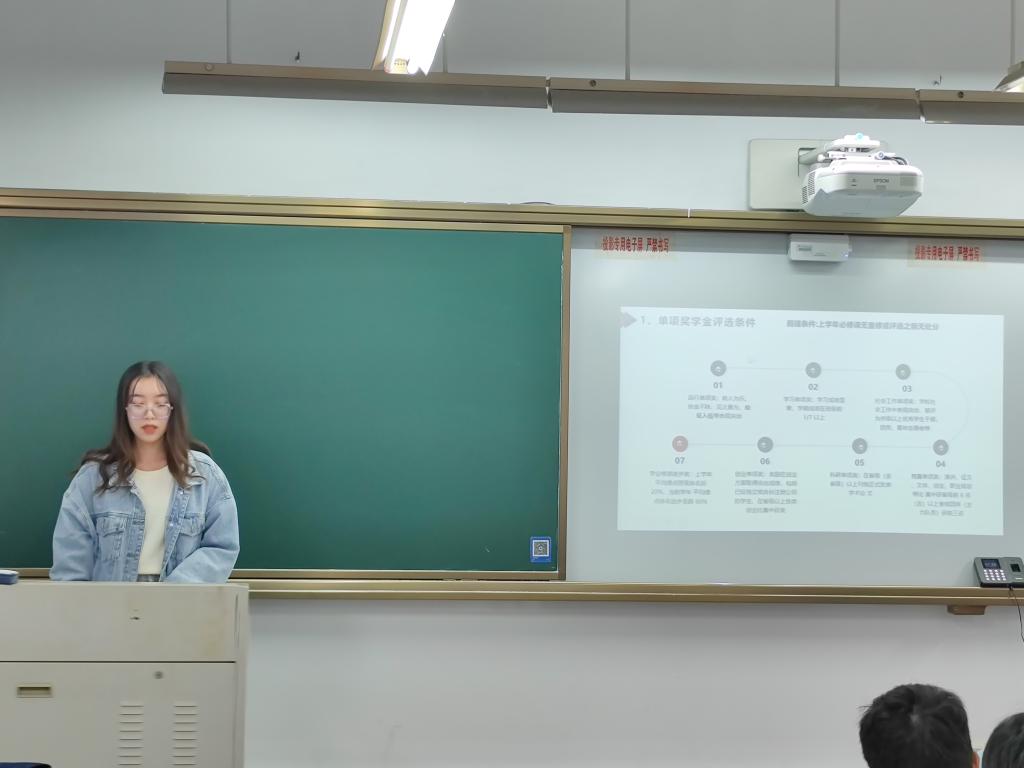 余晨怡同学向计本2的同学阐述了奖学金的分类和评定流程,她也将谷超豪奖学金作为一个具体的例子,向大家解释了一遍奖学金评选的具体流程。