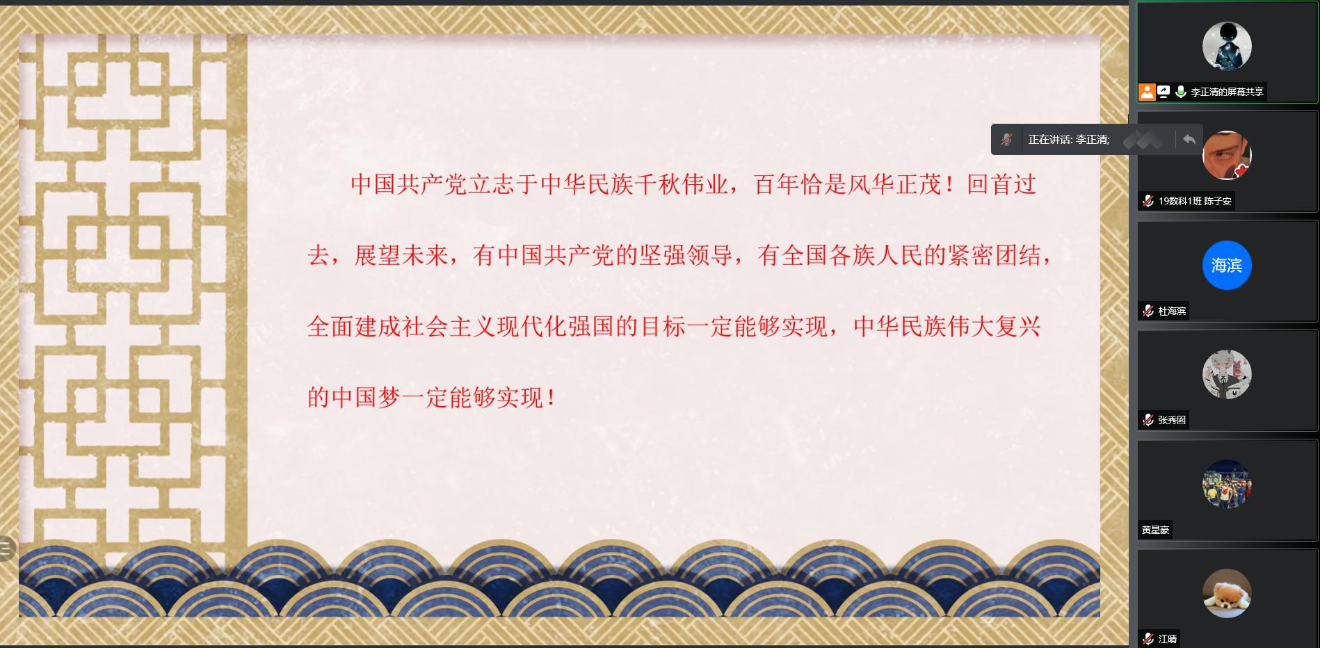 为认真学习贯彻习近平总书记在庆祝中国共产党成立100周年大会上的重要讲话精神,网赌平台推荐 本科生第四党支部于2021年7月24日下午16:00举行以“学党史,悟思想,办实事,开新局”为主题的线上学习会。本次学习会由18数科1班李正清同学主持,来自支部的22名同学参加了此次暑期线上学习会。