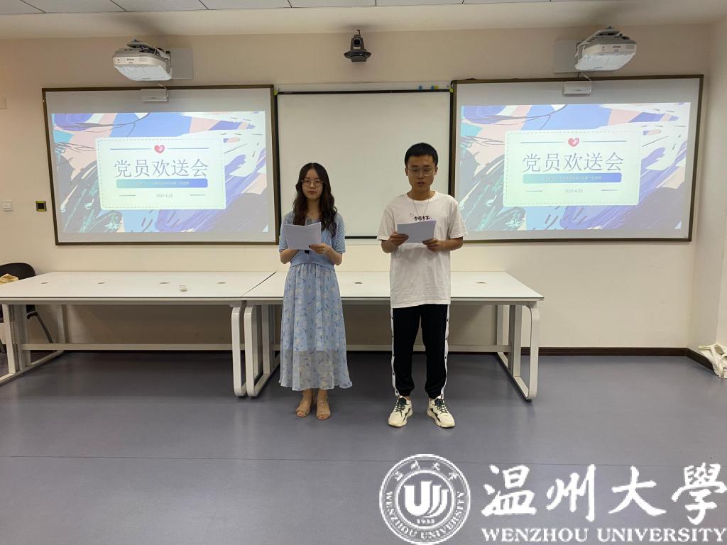 毕业生党员们进入欢送会会场,或带着毕业的欢欣,或带着离别的不舍。背景音乐响起,伴随着大屏幕播放毕业生党员在校时的画面,那样历历在目、令人难忘却又无法再现,而后主持人贾杰、冯煜瑶上台致词,为这次欢送会拉开了序幕。